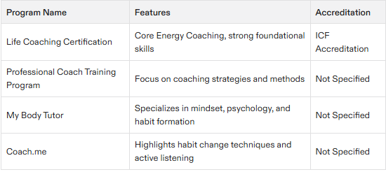 Life Coaching Certification: features and benefits, such as Core Energy Coaching and ICF accreditation.