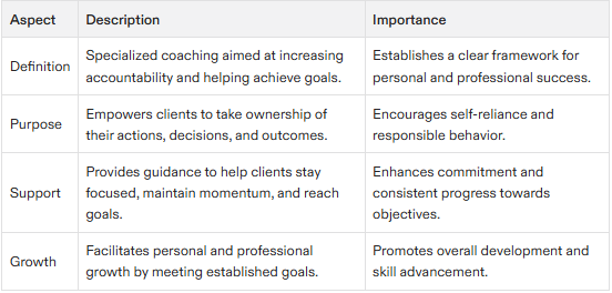 Accountability coaching is a specialized form of coaching that focuses on helping individuals or organizations increase their accountability and achieve their goals. The primary purpose of accountability coaching is to empower clients to take ownership of their actions, decisions, and outcomes. Accountability coaches provide the support and guidance needed to stay on track and maintain momentum. They work closely with clients to identify areas where accountability can be improved, set clear goals, and develop actionable plans. Through ongoing support and feedback, accountability coaches help clients stay committed and achieve their objectives, ultimately leading to personal and professional growth.