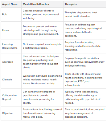 Mental health coaches and therapists have different roles and responsibilities in supporting mental health and well-being.