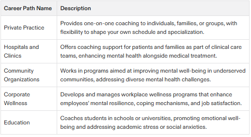 Mental health coaching is a growing field, and there are many career opportunities available for trained mental health coaches. Some of the most common career paths for mental health coaches include: