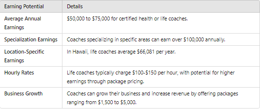 One of the primary incentives for enrolling in the Life Coach Academy to become a certified American life coach is the potential income. Earnings for certified health or life coaches typically range from $50,000 to $75,000 annually. Those who specialize have the possibility of making over $100,000 each year. Specific locales exhibit higher averages. For example, in Hawaii, life coaches can average yearly earnings of approximately $66,081.