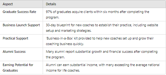 Graduates report high success rates, with 97% securing clients within six months, supported by robust business launch resources and ongoing support to ensure sustainable coaching practices.