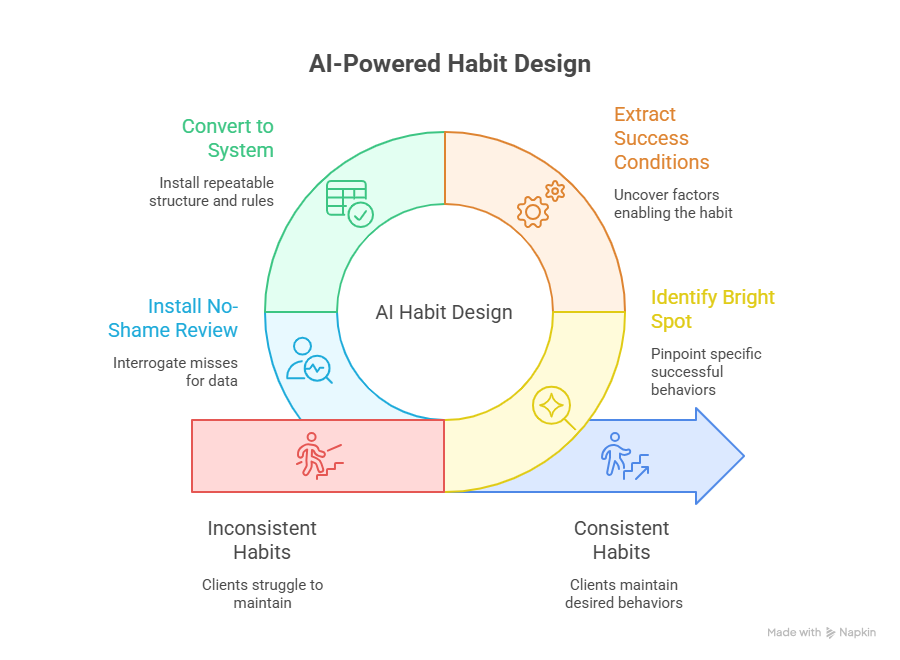 AI becomes transformational when you stop using it as reflection and start using it as habit design. Your client’s “best week” is basically a blueprint. Your job is to replicate it—without requiring perfect circumstances.