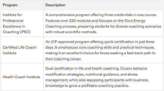 The Institute for Professional Excellence in Coaching, often referred to as iPEC, is hailed as the most extensive life coach certification program available. It boasts a unique advantage by offering participants the opportunity to obtain three different credentials through a single training course. This establishes a solid foundation for those looking to become professional life coaches, with its curriculum featuring over 220 modules that extensively cover various coaching aspects and equip you for a wide range of situations.