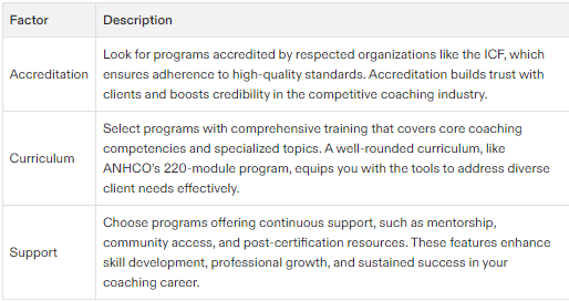 When selecting a life coach certification program, it’s essential to consider the following factors: