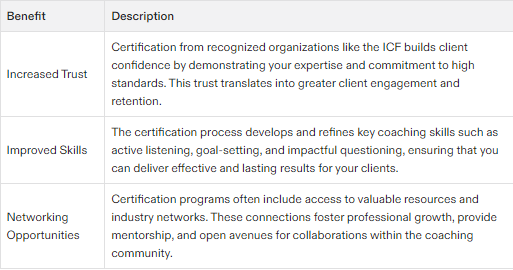 Increased trust with clients: A certification from a reputable organization like the ICF can help establish trust with potential clients. It demonstrates that you have the necessary training, skills, and experience to provide effective coaching services. Clients are more likely to feel confident in your abilities, knowing that you have met rigorous standards.