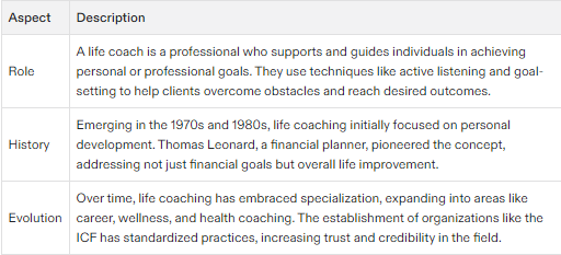 A life coach is a professional who helps individuals achieve their personal and professional goals by providing guidance, support, and accountability. Life coaches work with clients to identify and overcome obstacles, develop strategies for success, and improve their overall well-being. The role of a life coach is to empower clients to take control of their lives, make positive changes, and achieve their desired outcomes.