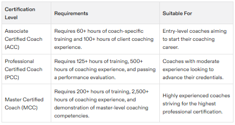 Coaches can choose from three levels of certification: ACC, PCC, and MCC.