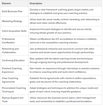 Building a successful coaching business requires a solid business plan, marketing strategy, and client acquisition skills.