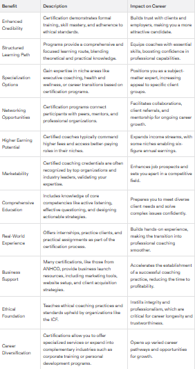 Certification enhances a coach’s credibility and marketability, opens networking opportunities, and can lead to higher earnings and diverse employment options.