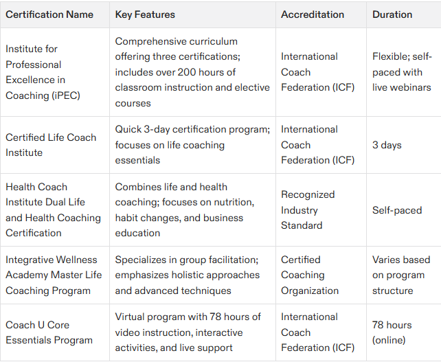 In this discussion, we will delve into five outstanding coaching certifications accessible in 2024 that can propel you toward success with their distinct benefits. Ranging from iPEC’s thorough curriculum designed to foster professional excellence to Certified Life Coach Institute’s expedited process of becoming certified, there exists an ideal match for every emerging life coach.