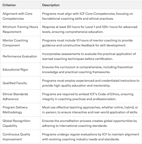 To become ICF-accredited, a coaching education program must meet several stringent criteria designed to ensure the highest standards of quality and effectiveness. These criteria include: