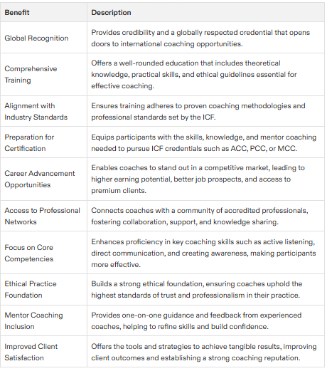ICF accredited programs can lead to increased earning potential and career advancement opportunities.