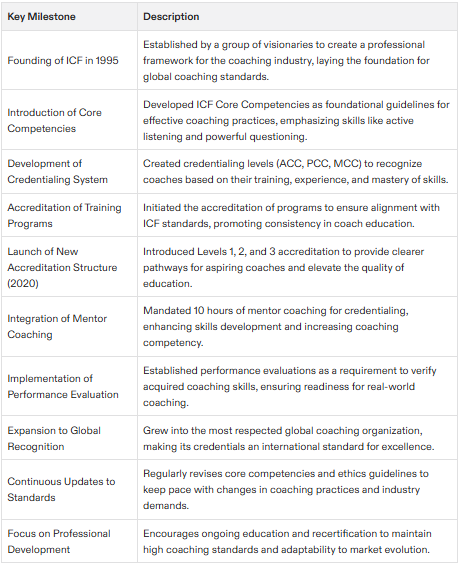 The ICF has also implemented a rigorous evaluation process for coaching education programs. This process ensures that programs meet the highest standards of quality and excellence, reinforcing the ICF’s commitment to advancing the coaching profession. By continuously evolving and setting high standards, the ICF has solidified its position as the gold standard in coaching education and accreditation.