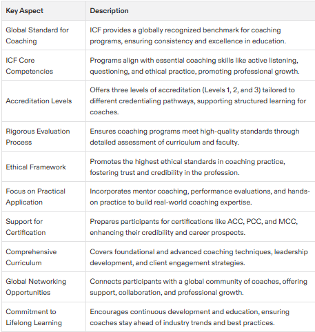 By meeting these criteria, ICF-accredited programs ensure that graduates are well-prepared to excel in the coaching profession and uphold the highest standards of coaching practice.