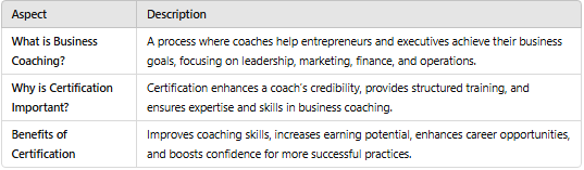 Business coaching is a process where coaches help entrepreneurs, executives, and professionals enhance their business performance, set and achieve goals, and improve leadership and other essential skills. Certification in business coaching is crucial as it demonstrates a coach’s expertise, credibility, and commitment to best practices. Through accredited training programs, coaches gain the necessary skills to guide clients effectively.