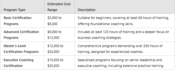 Executive Coaching Certification Programs: Focused on executive coaching, these programs typically require at least 125 hours of coach-specific training and can cost between $10,000 to $20,000. They are tailored for those who want to specialize in coaching senior leaders and executives.