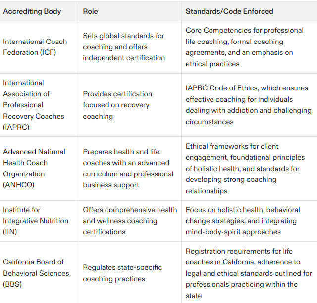 The coaching industry relies on accreditation and standards set by leading organizations like the International Coach Federation (ICF), which offers independent certification.