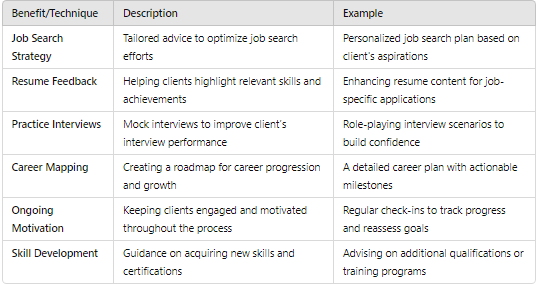 In the realm of career coaching, coaches provide multifaceted assistance to their clients by offering customized feedback on resumes to showcase their distinct skills and accomplishments. They also assist in devising job search strategies tailored specifically to the client’s aspirations within their career, equipping them with readiness and assurance as they navigate the jobs landscape.