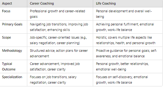 The focus of career coaching is on enhancing professional progression, whereas life coaching centers around the advancement of personal growth and emotional health. Through guiding clients towards a multitude of personal objectives that span multiple aspects of their existence, including connections to general contentment, life coaches assist in crafting a well-rounded and satisfying life.