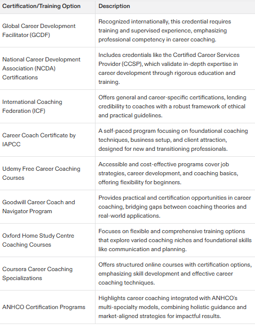 These include certifications from the National Career Development Association (NCDA), the International Coaching Federation (ICF), and the International Association of Professions Career College.
