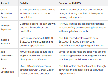 Graduates experience strong job placement rates and effective client acquisition strategies, highlighting the significant demand for certified career coaches in the job market.
