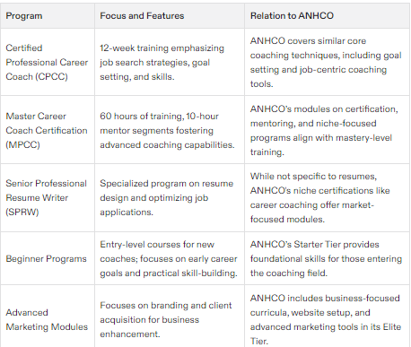 The institute presents an extensive selection of training programs that encompass everything from entry-level courses up to advanced certification levels including but not limited to: Certified Professional Career Coach (CPCC) Program, Senior Professional Resume Writer (SPRW) Program, and Master Career Coach Certification. Each training program meticulously prepares students by combining thorough instruction with practical application experiences, ensuring all graduates emerge fully prepared for successful careers in coaching.