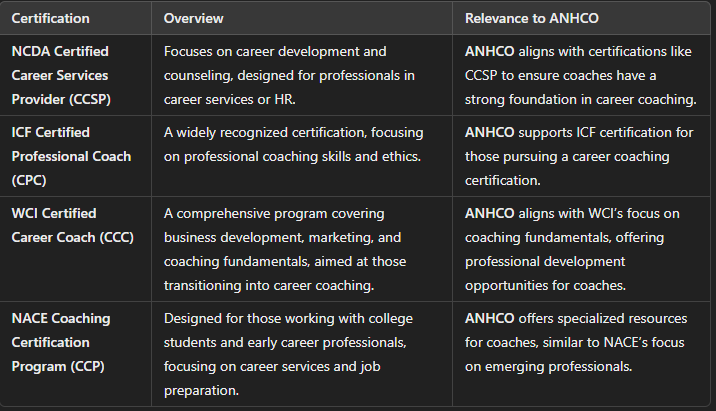 The NCDA Certified Career Services Provider (CCSP) and the ICF Certified Professional Coach (CPC) are two well-established certifications in the field.