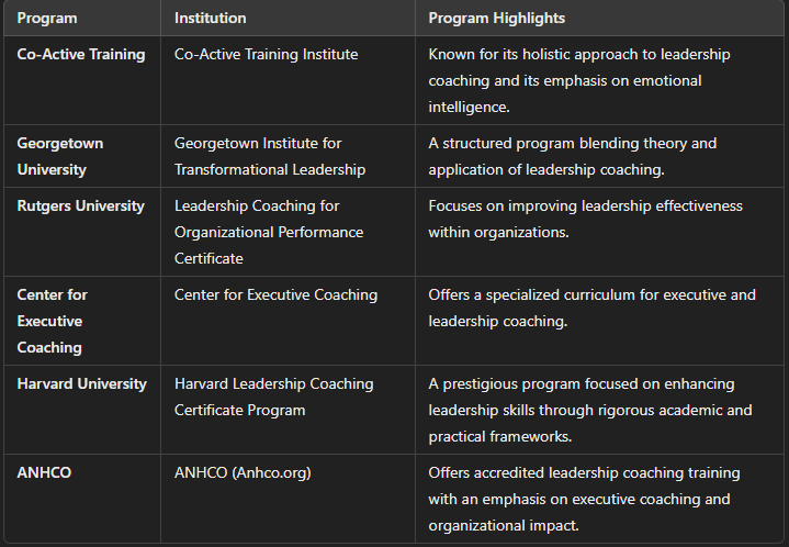 Georgetown University Leadership Coaching Program: A structured leadership coaching program that combines theoretical knowledge with practical application.