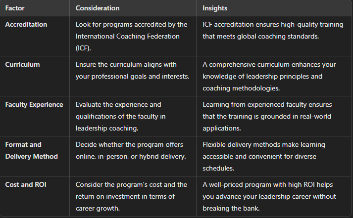 Check the program’s accreditation and reputation, and ensure it prepares you to become a professional certified coach