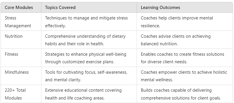 In this course, students gain more than theoretical knowledge—the emphasis on practical engagement and acquiring real-world experience is substantial. Through segments that delve into various aspects of health and wellness materials, trainees are thoroughly equipped with current information and details needed to adeptly navigate client-specific circumstances throughout their coaching journey.