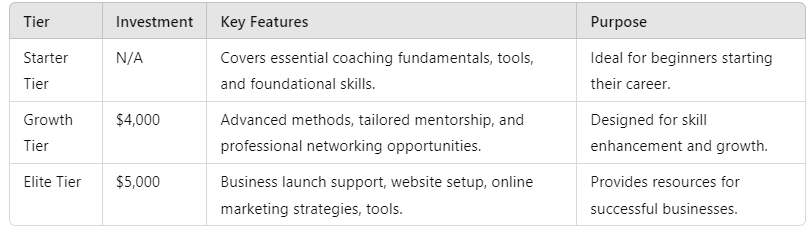 At the pinnacle lies the Elite Tier, accessible at $5,000. It furnishes coaches with an all-encompassing blueprint for launching their business ventures. It arms them with an arsenal of tools and supports designed specifically to nurture a flourishing enterprise within the coaching industry.