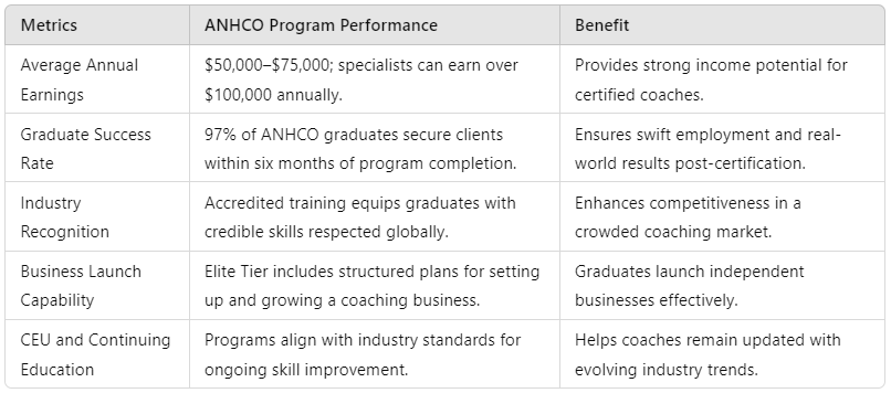 The ANHCO Health and Life Coach Certification Program is recognized as an exemplary option for those looking to become coaches. This program provides participants with the essential skills necessary for success in the fields of health and life coaching through a thorough curriculum encompassing crucial topics required for professional training. Upon completion, individuals can anticipate potential yearly earnings ranging from $50,000 to $75,000. Specialized coaches have the opportunity to earn over $100,000 annually.