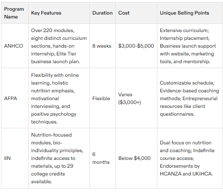 Choosing the right health coach certification program is essential for aligning with your personal career aspirations and needs. Three notable programs that excel in providing extensive curriculums and possess esteemed reputations are ANHCO, AFPA, and IIN.