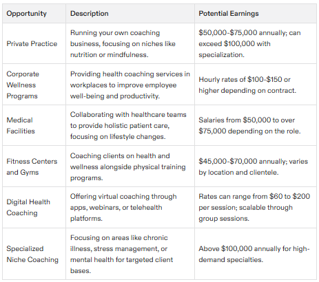 This surge in growth opens up a multitude of professional avenues for those with certification as health coaches, offering opportunities in environments such as: