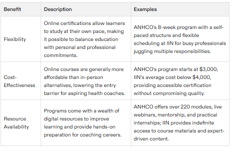 Online health coach certifications offer flexibility, affordability, and comprehensive resources, making them accessible for aspiring health coaches.