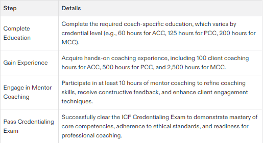 Each credential requires a combination of coach-specific education and extensive client coaching experience, ensuring coaches are well-prepared.