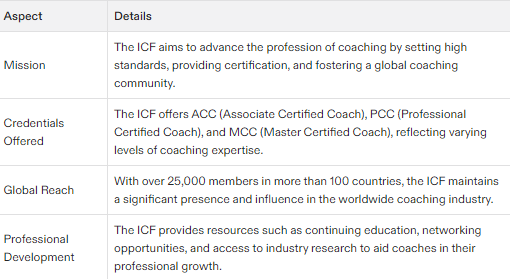 In addition to credentialing, the ICF offers numerous resources for professional development, including continuing coach education, networking opportunities, and access to a wealth of industry research. By joining the ICF, coaches become part of a vibrant, supportive community that is committed to advancing the coaching profession and making a positive impact on clients’ lives.
