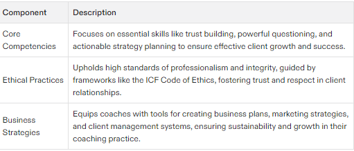Curriculum: Look for programs that cover the Core Competencies recognized by the ICF and other essential coaching concepts. A comprehensive curriculum is vital for thorough preparation.