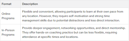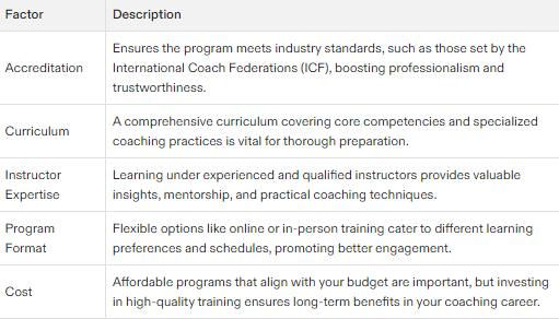 Accreditation: Ensure the program is accredited by reputable organizations such as the International Coach Federation (ICF). This guarantees that the training meets high industry standards.