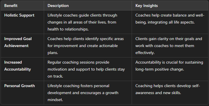 Lifestyle coaches help clients achieve results in various areas of their lives, such as health, wellness, and relationships.