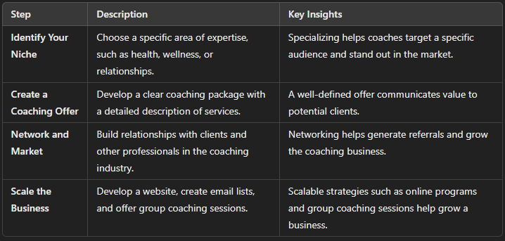 Develop a plan to scale the business, including hiring additional coaches or offering group coaching sessions.