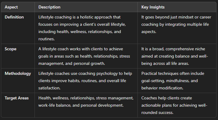 Lifestyle coaching is a holistic approach to coaching that focuses on a client’s entire lifestyle, including their habits, routines, and behaviors, and is grounded in coaching psychology.