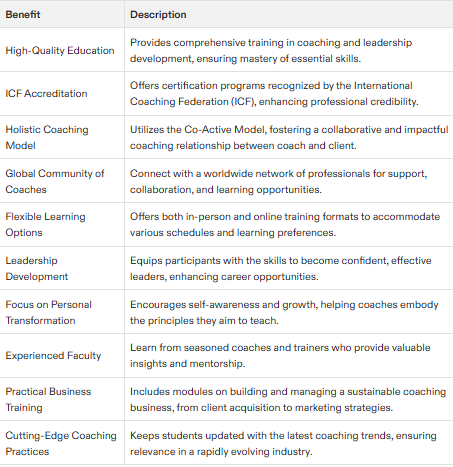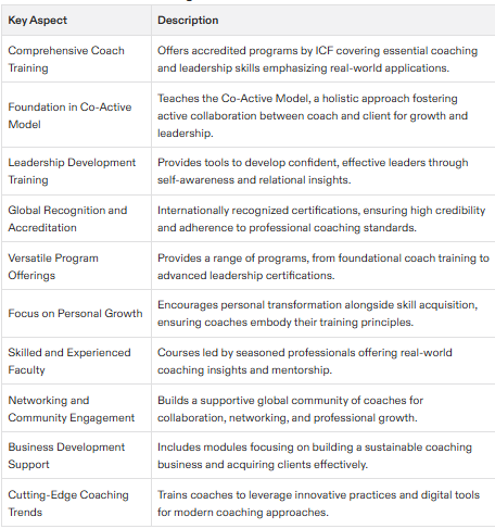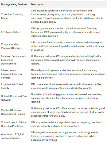 CTIs provide a comprehensive education in coaching skills, business development, and leadership development, emphasizing Co-Active coaching's comprehensive approach and effectiveness in personal growth and leadership development.