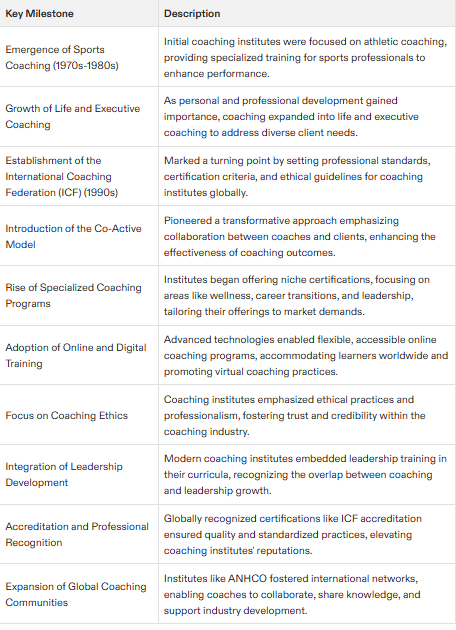 In the 1990s, the establishment of the International Coach Federation (ICF) marked a significant milestone in the evolution of coaching institutes. The ICF provided a professional framework for coaches and coaching institutes, setting standards for coaching education, certification, and ethics. This helped to establish coaching as a recognized profession and ensured that coaching programs met high standards of excellence.