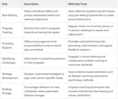 A wellness coach helps individuals set reasonable goals and develop a plan for reaching them. Unlike a life coach, who may focus on broader personal and professional goals, a wellness coach specifically helps individuals set reasonable health and wellness goals and develop a plan for reaching them.
