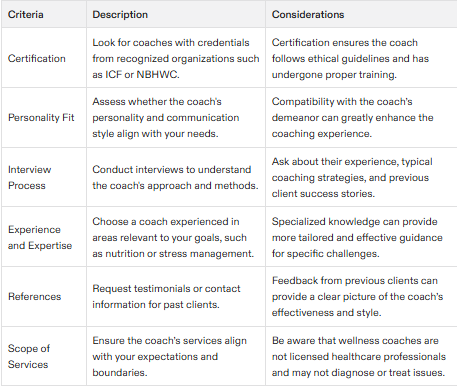 Look for a coach with certification from a reputable organization, such as the International Coach Federation (ICF) or the National Board for Health and Wellness Coaching (NBHWC).