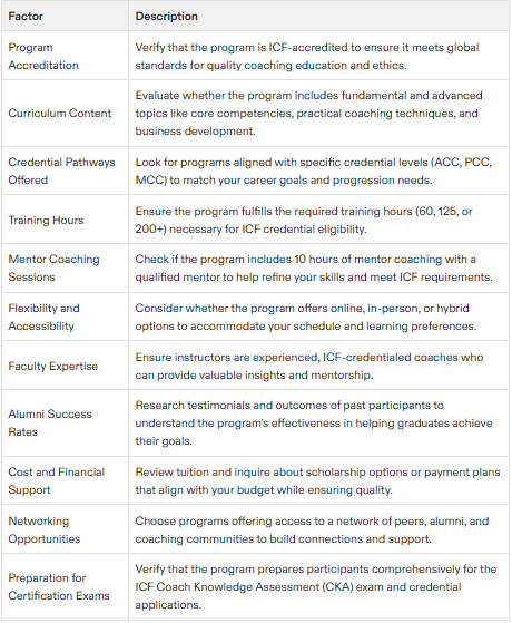 Factors to consider when choosing an ICF-accredited coaching program, including an accredited ICF training program, include the program’s curriculum, training hours, and mentor coaching.
