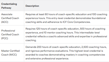 Graduates of our program may apply for the Associate Certified Coach (ACC) Credential and/or the Professional Certified Coach (PCC) Credential.
