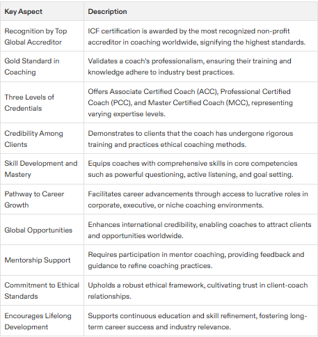 In conclusion, the International Coach Federation (ICF) stands as the gold standard for coach certifications, symbolizing excellence and professionalism in the coaching profession. The ICF offers various levels of certification, including the Associate Certified Coach (ACC), Professional Certified Coach (PCC), and Master Certified Coach (MCC) credentials. Achieving these credentials requires completing an ICF-accredited program, which provides the essential training and mentor coaching to develop the skills and knowledge necessary to become a certified coach.